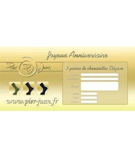 - Nom du bénéficiaire, Titre du message (par ex: Joyeux anniversaire Papa), Votre message personnel, Adresse du bénéficiaire pour un envoi direct. Dans tous les cas, notre équipe vous recontactera avant l'envoi définitif du bon pour valider avec vous les différents éléments qu'il contient. Le bénéficiaire n'aura plus qu'à suivre les instructions jointes avec le bon cadeau pour choisir ses paires de chaussettes parmi tous les modèles de la gamme Elégance, sans exceptions.